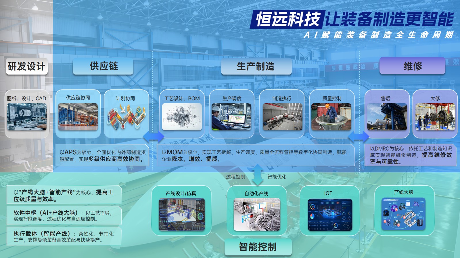 基于智能制造核心能力,恒遠科技橫向延伸打造裝備全生命周期總集服務,構建產(chǎn)業(yè)鏈數(shù)字化協(xié)同平臺與覆蓋設備大修維護的全維運維保障體系,形成貫穿研發(fā)設計、供應鏈協(xié)同、生產(chǎn)制造到售后維修的完整價值鏈。
